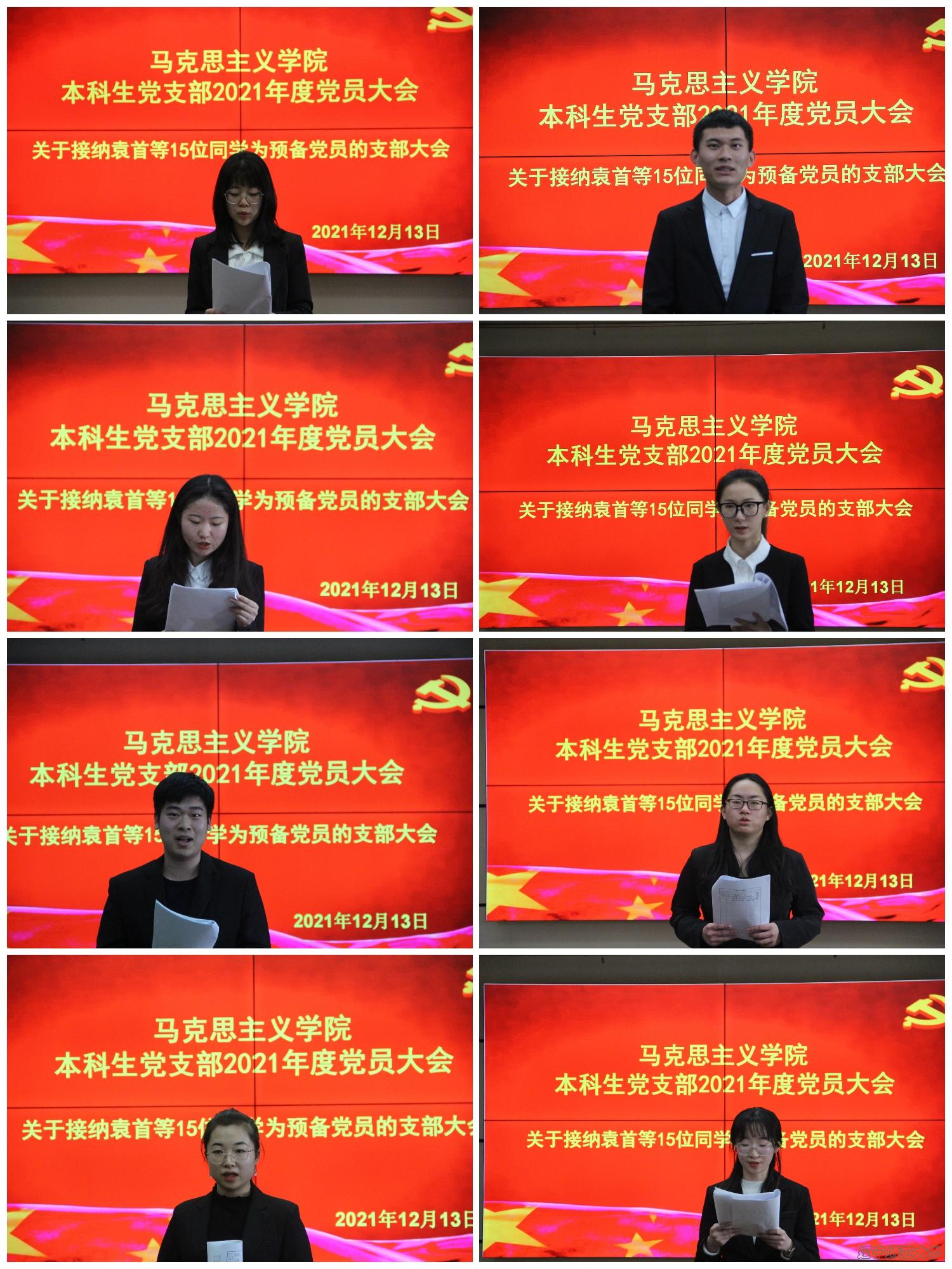 首先,袁首、唐佳宇、关一凡、高子轩、何姝霖、牟丽霞、刘卿卿、张子怡、刘垚、刘克卉、李溟慧、于佳鑫、张晓、柳子健、台合语15位同学分别向大会宣讲了自己的入党志愿,汇报了自己的现实表现、家庭及主要社会关系情况,表达了自己申请加入党组织的迫切心情和今后继续努力的决心。