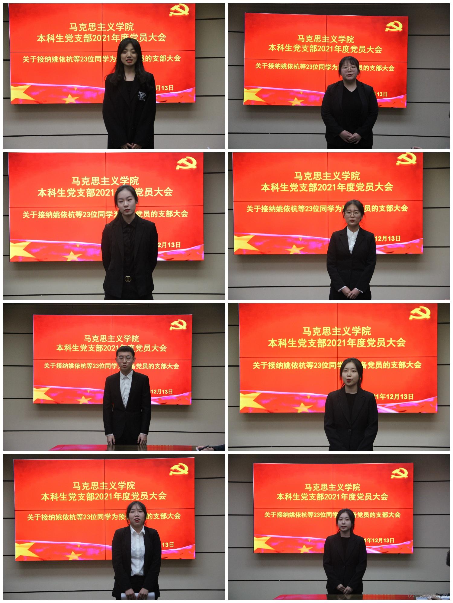 会上,姚依杭、杜洛桐、张悦、张展鹏、宁詹雪、刘泓杉、樊一诺、肖洋、唐灵潇、王丹、付颖、王晓春、董欣、沙龙喜、徐嘉、吕美慧、张思雨、钱英莺、黄志兰、张楚涵、刘松阳、马俊杰、汪芮23位发展对象分别宣读了自己的入党志愿书,汇报了自己的现实表现、家庭及主要社会关系情况,表达了自己对党组织的认识、迫切的入党心情和今后继续努力的决心。